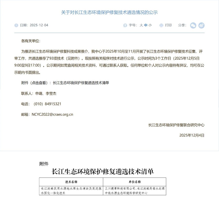 近日,三川德青科技有限公司自主研发的“长江流域饮用水源地水库生态清淤及底泥脱水固化一体化技术”成功入选长江生态环境保护修复技术目录。