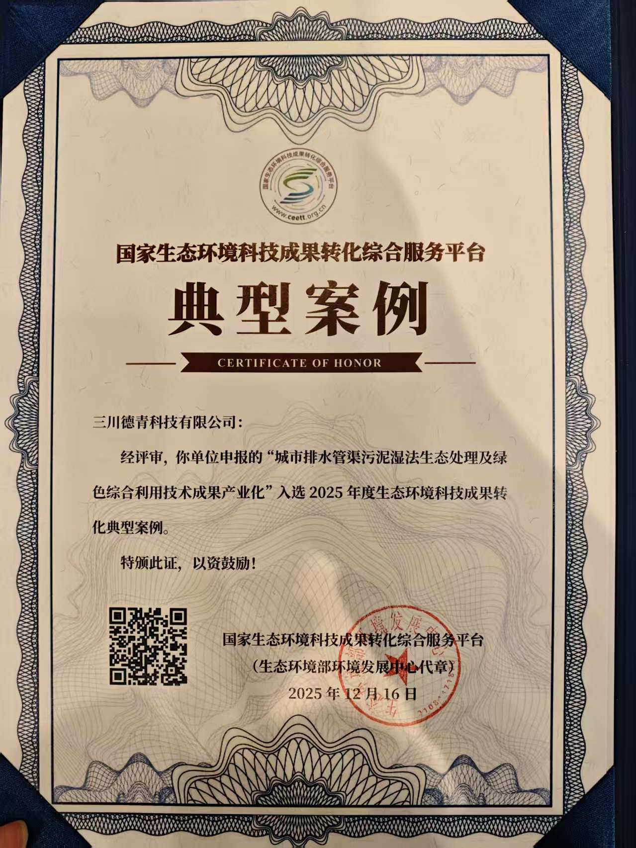 1月28日,三川德青科技有限公司受邀参加生态环境部国家生态环境科技创新与成果转化大会。公司自主研发并实施的“城市排水管渠污泥湿法生态处理及绿色综合利用技术成果产业化”,从众多先进成果中脱颖而出,入选中华人民共和国生态环境部2025年生态环境科技成果转化典型案例。