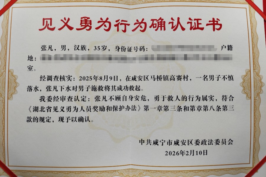 表彰仪式上,现场宣读了中共咸宁市咸安区委政法委员会对张凡见义勇为行为的认定决定,并颁发了见义勇为行为确认证书及奖励金。咸安区委政法委相关负责人向张凡致以崇高敬意和衷心感谢,表示张凡的义举不仅挽救了一个家庭,更向社会传递了温暖与力量。