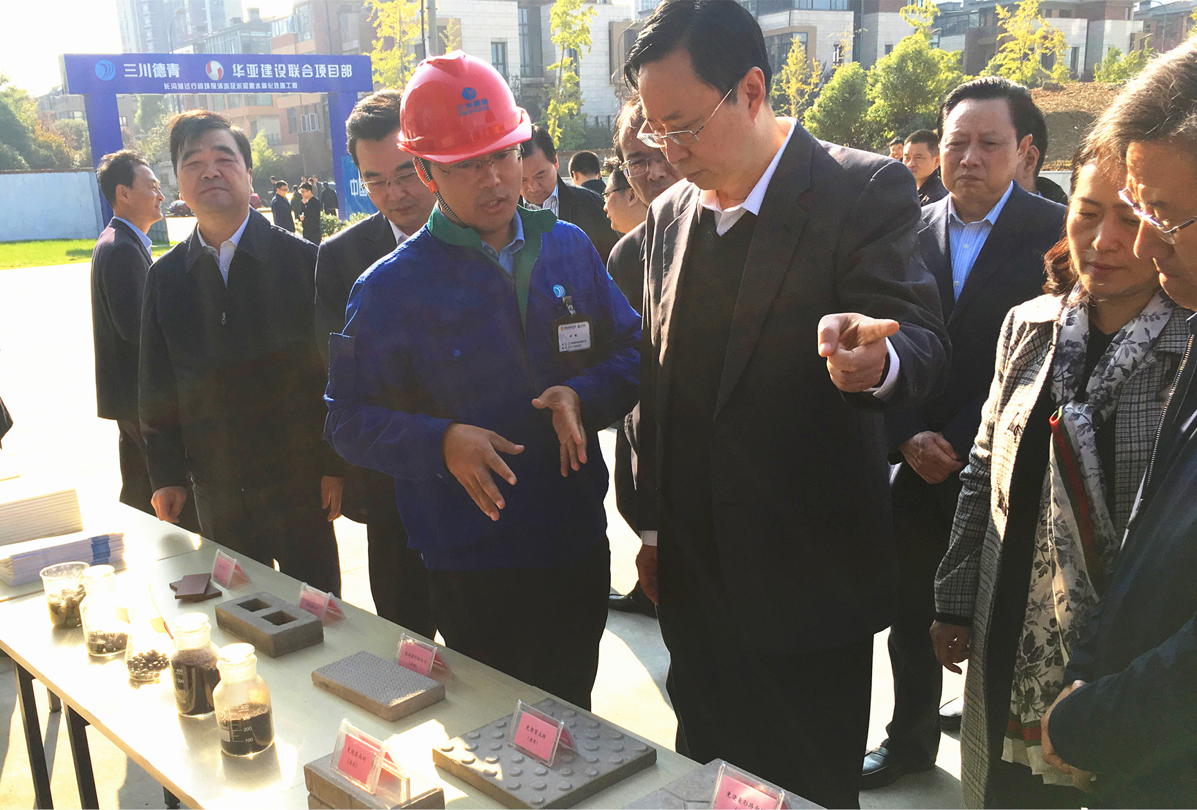 10月31日,江苏省生态保护引领区建设现场推进会在三川德青长沟河环保清淤脱水固化处置工程项目现场召开。江苏省副省长蓝绍敏带领省水利厅、省环保厅、省海洋与渔业局、省太湖办等有关部门负责人参加推进会,专题调研 “河长制”工作,并视察我公司长沟河环保清淤脱水固化处置工程项目现场,参观环保清淤及淤泥脱水固化资源化处置技术工艺;听取公司环保清淤及淤泥脱水固化处置工作情况汇报。蓝绍敏对三川德青公司作为央企积极投入到国家环保建设领域的作为给予充分的赞誉。