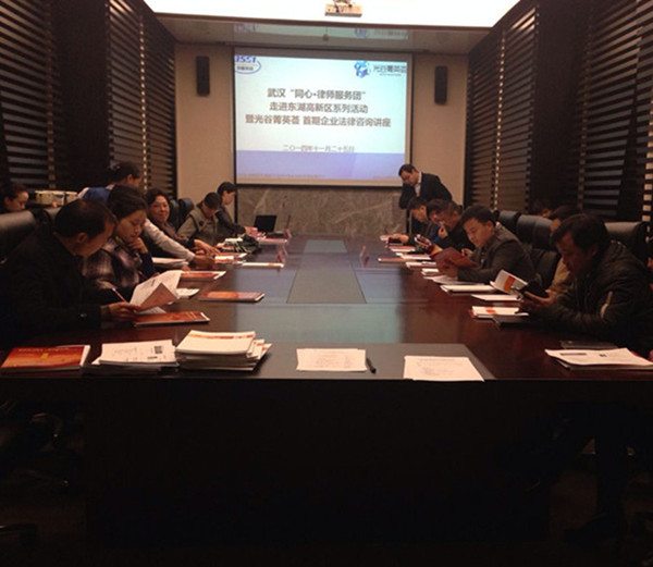 2014年11月25日,公司法务人员2人参加了在武汉未来科技城金殿一楼会议室举办的光谷菁英荟首期企业法律咨询讲座。东湖新技术开发区人才与创业办公室聘请湖北省律师协会副会长、北京中伦(武汉)律师事务所主任张粒律师做了以“企业法律风险管理模式机制探讨”为主题的讲座。张粒律师以法律风险管理需求调查分析为切入点,结合法律风险定义、类别、产生原因及风险管理的内容,以知识产权、合同管理为例,向参会人员讲授了如何建立法律风险防范体系。通过参加此次活动,参会人员充分认识到企业法务工作与风险管理结合的重要性,公司也因此与武汉当地的法律咨询服务机构进行了顺利对接,有效促进了公司法律风险防范体系建设的推进。