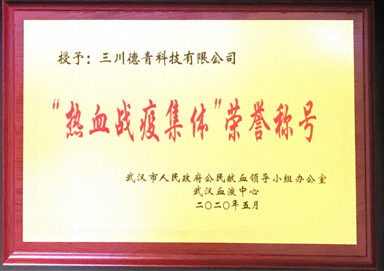 近日,三川德青公司被武汉市政府公民献血领导小组办公室、武汉血液中心联合授予“热血战疫集体”荣誉称号,表彰公司作为央企,在抗击新型冠状病毒疫情中,率先担当积极参与献血工作,为缓解血库供血量紧张所做出的贡献。