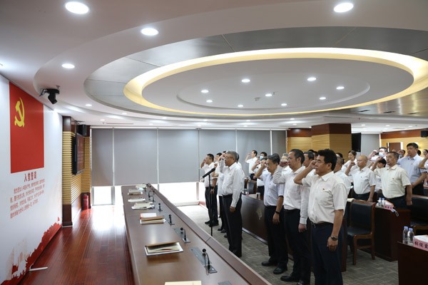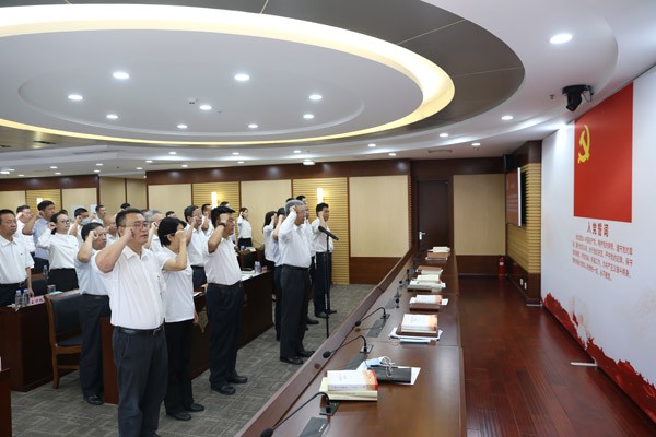 面向鲜红的中国共产党党旗,总部全体党员整齐列队,举起右拳,发出誓言。高亢洪亮、铿锵有力的誓言响彻全场,再一次激励大家不忘初心、牢记使命,坚定理想信念,永远跟党走,积极投身建设“一流地质企业”、打造“一流绿色资源环境服务商”的生动实践,为推动冶金地质改革改制和高质量发展,为建设社会主义现代化国家作出新的更大贡献,以更好的成绩庆祝党的百年华诞。
